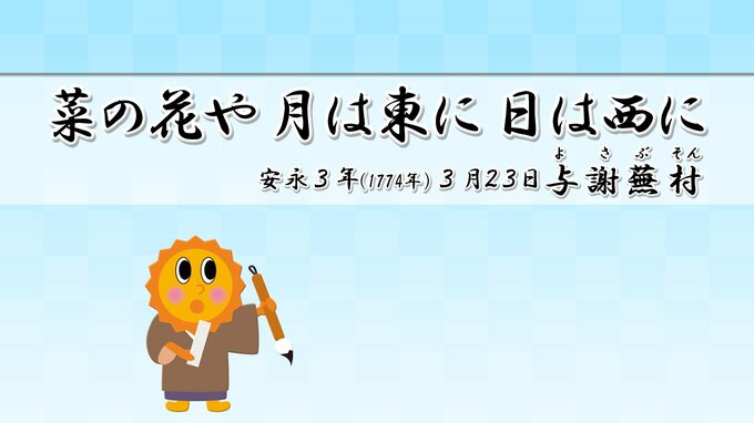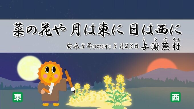 『菜の花や 月は東に 日は西に』14日(金)今夜満月 250年前 与謝蕪村が詠んだ情景が見られる?【今夜の天気】 2025年3月14日(金) 15:00 国内 天気 菜の花や 月は東に 日は西に 安永3年(1774年)旧暦の3月23日に、与謝蕪村が兵庫県六甲の摩耶山を訪れたときに詠んだ句です。 夕暮れ時に、西の空に〈沈む夕日〉東の空に〈昇る月〉が見えていたことから、〈満月〉あるいは〈満月〉前後の月と思われます。