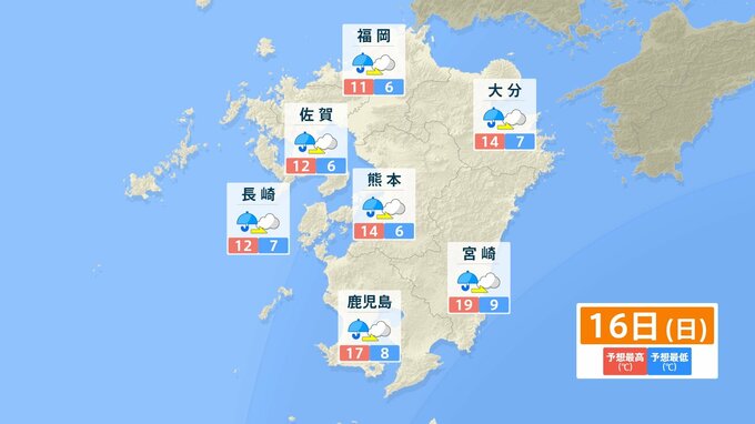 【九州土日雨】まとまった雨 風も強く 春の嵐に しかも「土曜から寒の戻り」【福岡・佐賀・長崎・大分・熊本・宮崎・鹿児島】雨のシミュレーション15日(土)~16日(日) 2025年3月14日(金) 15:00 国内 天気 15日(土)16日(日)の天気予報 土日はともに雨の予報です、雨が止むのは16日(日)の午後の見込みです。 画像では、天気予報と予想最低・最高気温を掲載しています。