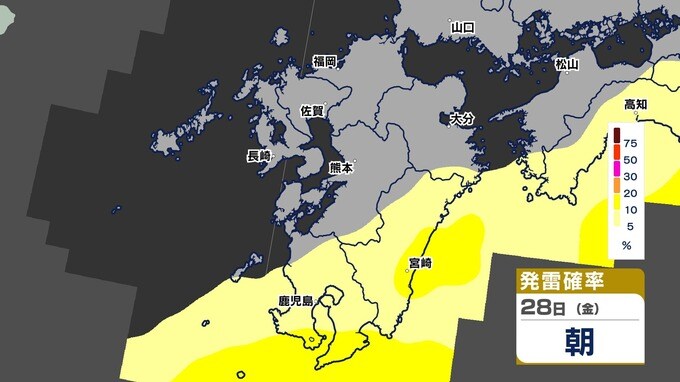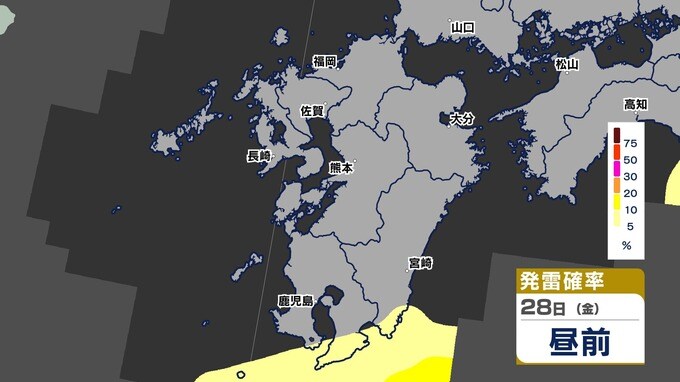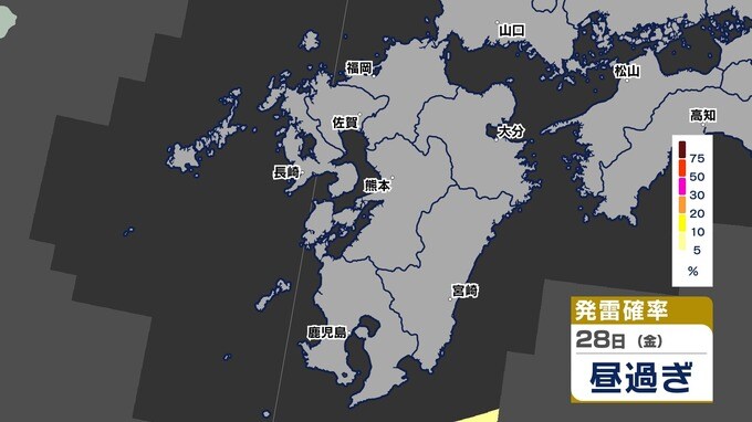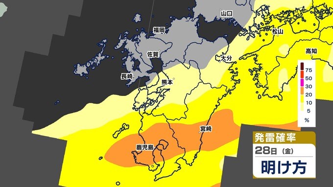 3. 【九州 落雷や突風に関する気象情報】大気の状態が非常に不安定 雨のあと週末は寒の戻り《花冷え》【雨と発雷確率のシミュレーション27日(木)~28日(金)】福岡・佐賀・長崎・大分・熊本・宮崎・鹿児島