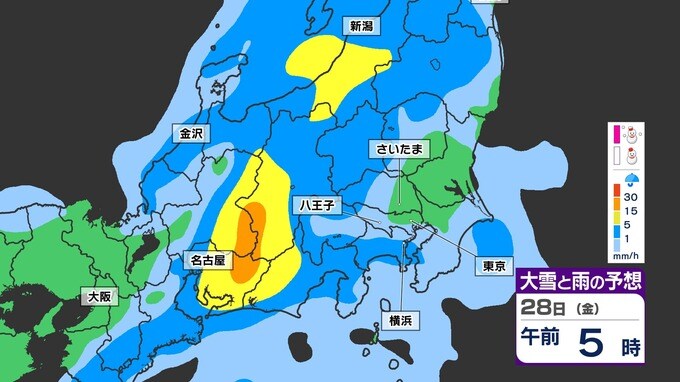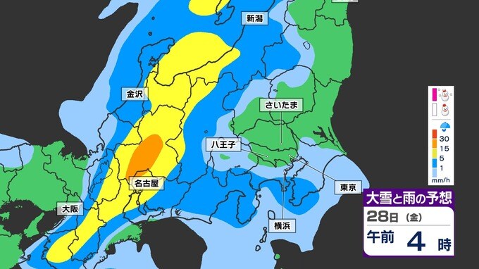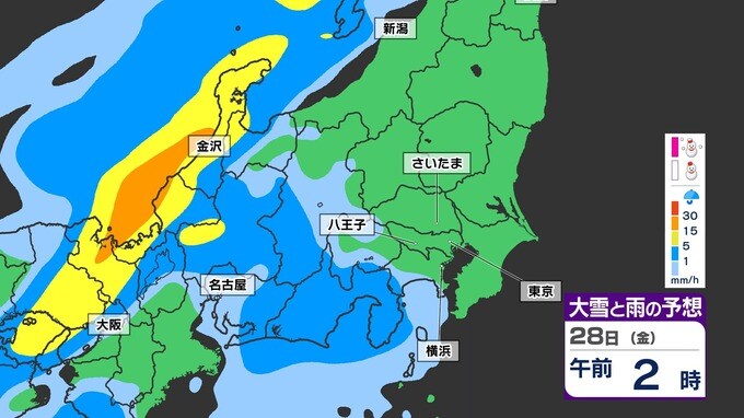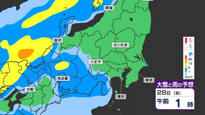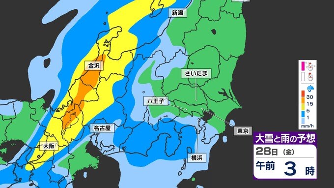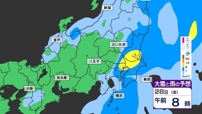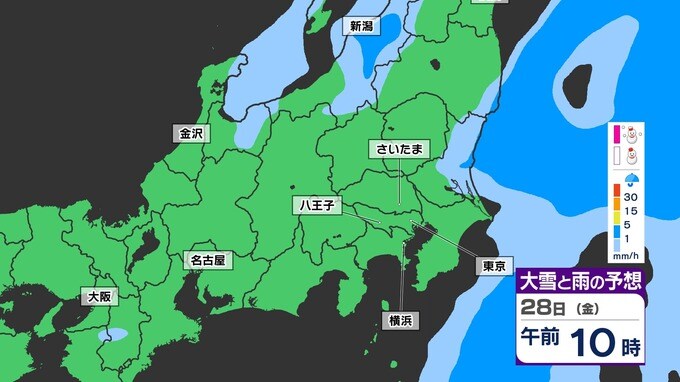 【東京 横浜 さいたま 首都圏】あす朝大雨 初夏の陽気 から 真冬へ逆戻り<寒の戻り”すぎ”>雪が降る所も【大雨はいつ? 雪はどこで?】雨と雪のシミュレーション28日(金)~30日(日) 2025年3月27日(木) 20:00 国内 天気 雨と雪のシミュレーション28日(金)~30日(土) 28日(金)朝は〈本降りの雨〉です、時間に余裕を持って家を出ましょう。 29日(土)30日(日)は〈雨〉が〈雪〉に変わる所がありそうです。多摩地区にも雪が予想されています。画像で確認できます。 「赤」は「大雪」、「白」は「雪」、「青」「黄」は雨の予想
