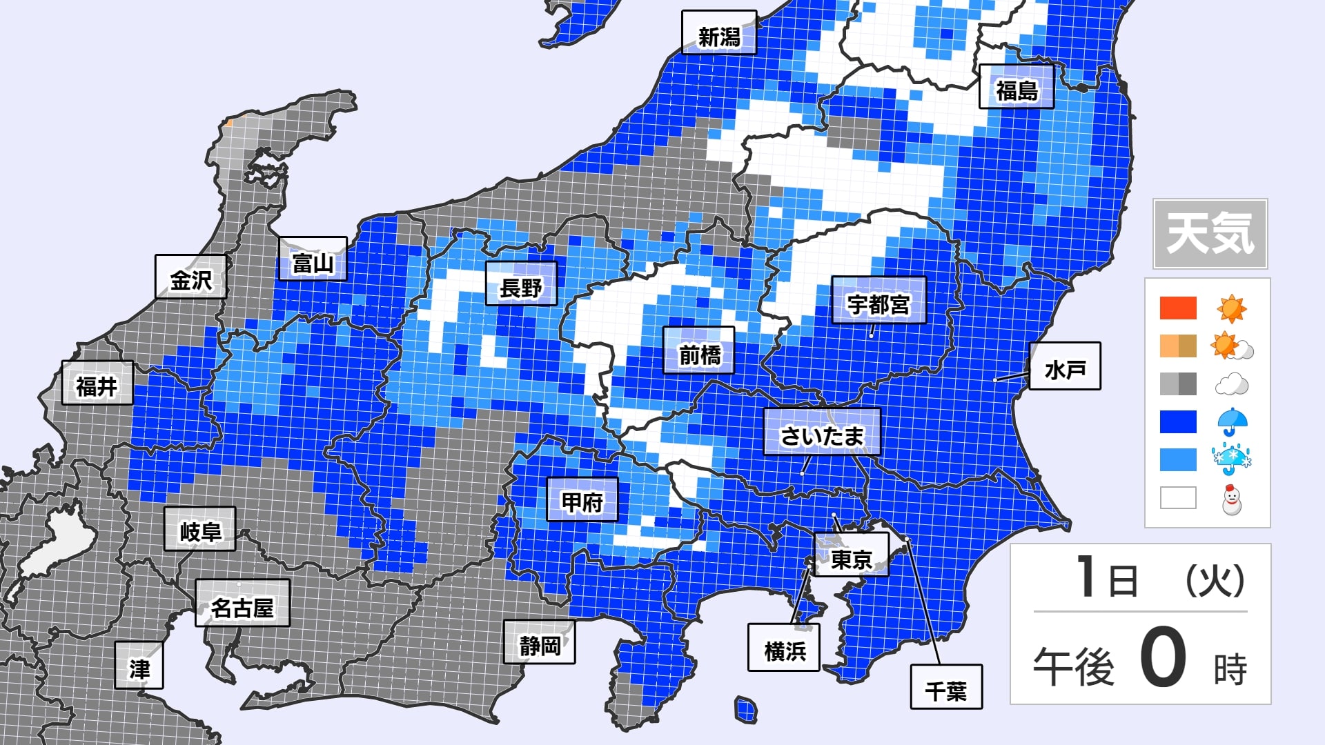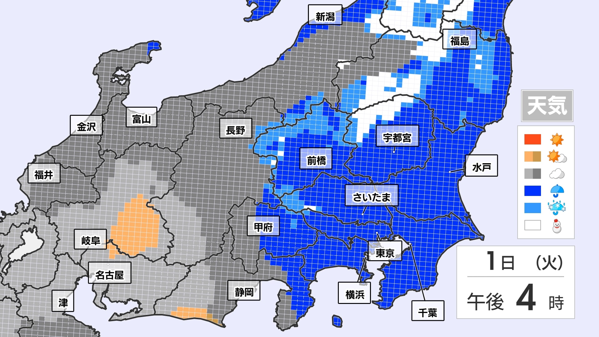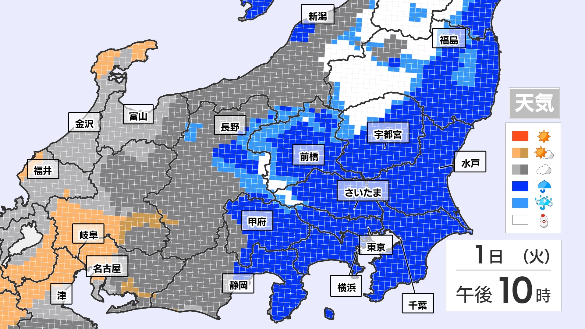 【大雪情報発表】東京多摩10cm 神奈川山地5cm 埼玉秩父5cm【東京・神奈川・埼玉 新年度スタートは雪か】気象庁の予報詳しく 雪・雨シミュレーション31日(月)~4月3日(木)/ 雪はいつから どこで降る? 2025年4月1日(火) 10:00 国内 天気 「オレンジ」は「晴れ」、「グレー」は「くもり」、「青」は「雨」、「水色」は「みぞれ」、「白」は「雪」の予想