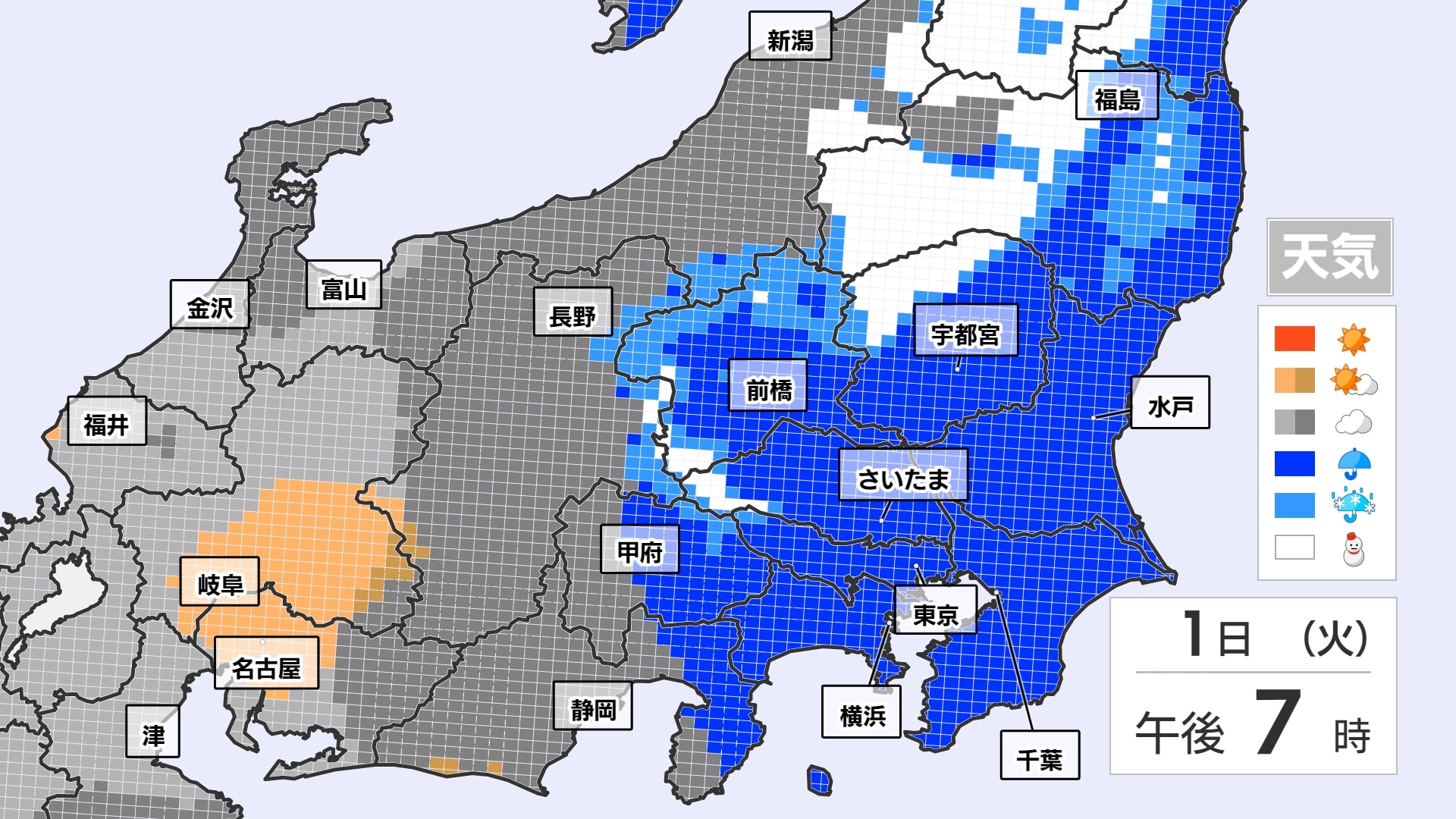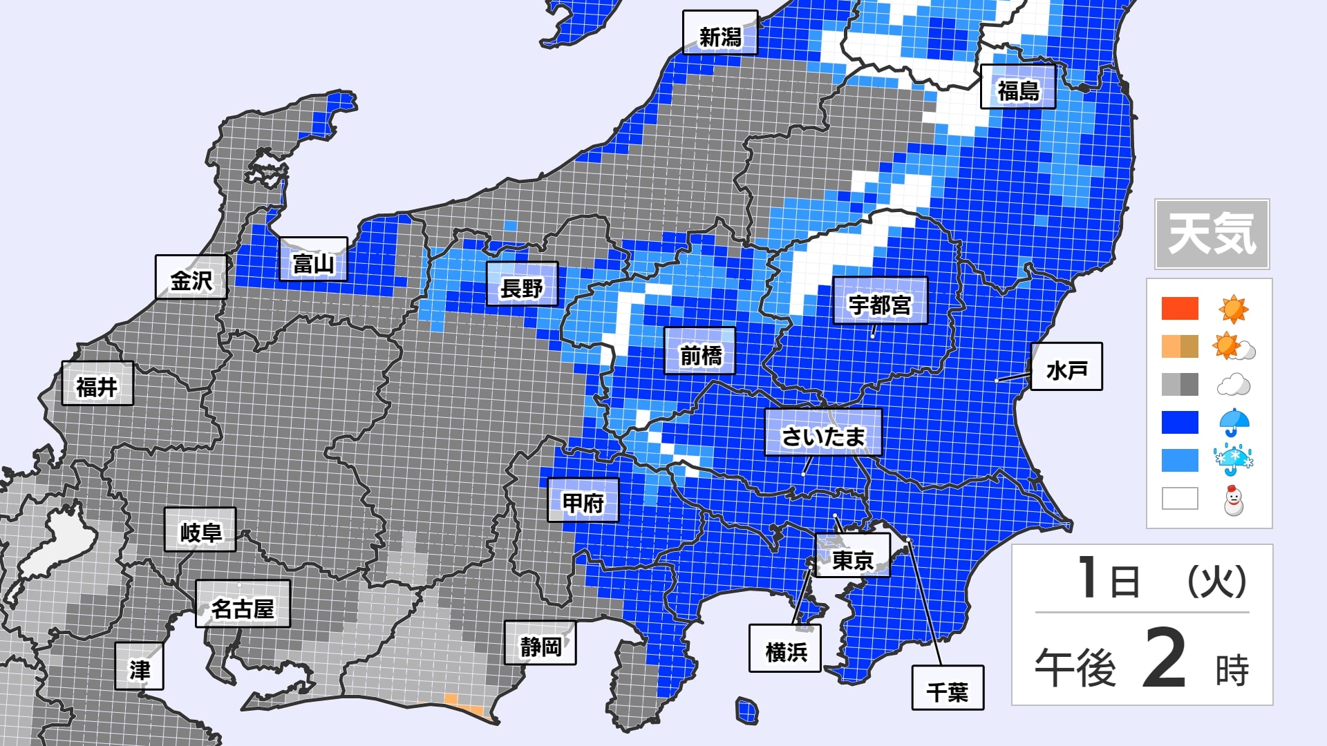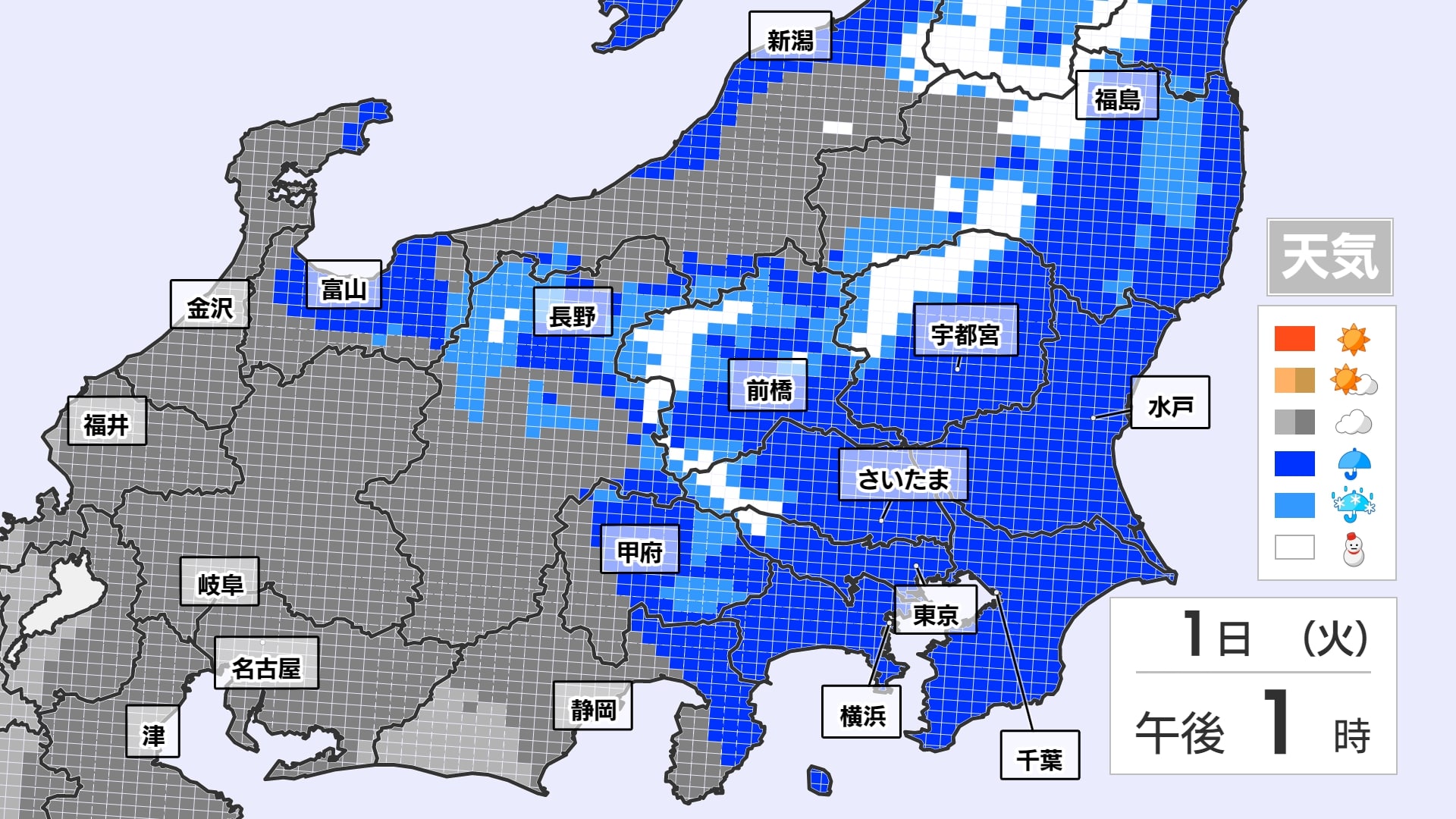 【大雪情報発表】東京多摩10cm 神奈川山地5cm 埼玉秩父5cm【東京・神奈川・埼玉 新年度スタートは雪か】気象庁の予報詳しく 雪・雨シミュレーション31日(月)~4月3日(木)/ 雪はいつから どこで降る? 2025年4月1日(火) 10:00 国内 天気 「オレンジ」は「晴れ」、「グレー」は「くもり」、「青」は「雨」、「水色」は「みぞれ」、「白」は「雪」の予想
