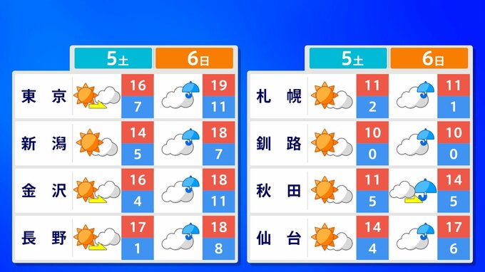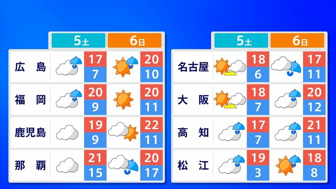【東京 大阪 名古屋 雨はいつから?】西から下り坂 雨は5日(土)九州 中国 四国地方で 6日(日)近畿 東海 関東 東北 北海道地方で降る【雨のシミュレーション5日(土)~7日(月)】 2025年4月5日(土) 07:00 国内 天気 土日の天気予報 主要都市の土日の天気予報です。《雨の予報》は、 5日(土)には福岡・広島・高知・松江 で発表されています。 6日(日)には東京・大阪・名古屋をはじめ札幌まで、雨の予報です。 画像で確認できます。