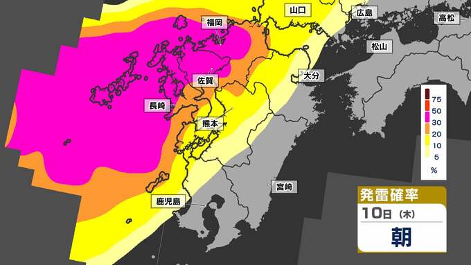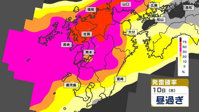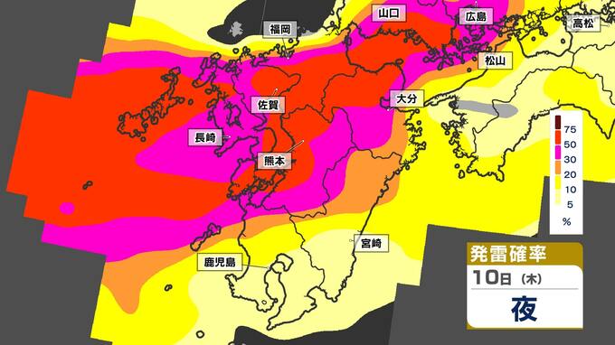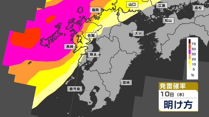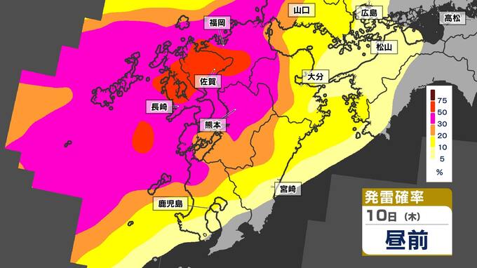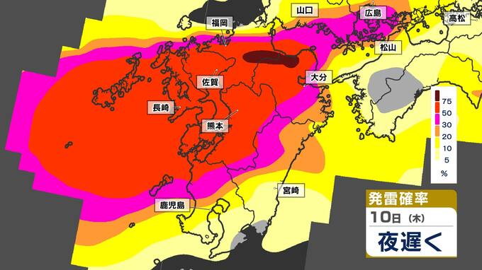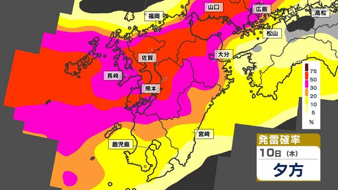 【落雷と突風に関する気象情報】発表 大気の状態が非常に不安定 急な強い雨に注意 気象台発表 気象情報を詳しく【発雷確率と雨のシミュレーション10日(木)~11日(金)】福岡・佐賀・長崎・大分・熊本・宮崎・鹿児島 2025年4月10日(木) 16:30 国内 天気 【発雷確率】のシミュレーション 〈発雷確率〉つまり雷の発生確率は、大気の状態の目安になります。確率が高ければ〈大気の状態が不安定〉で、それだけ〈急な強い雨〉や〈雷〉〈ひょう〉が発生する可能性が高くなります。画像で確認できます。