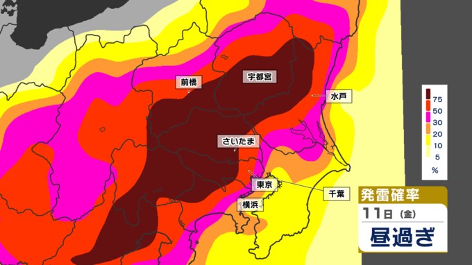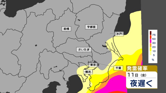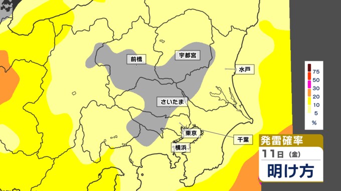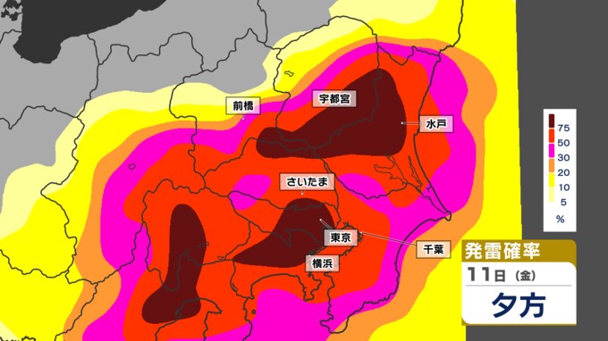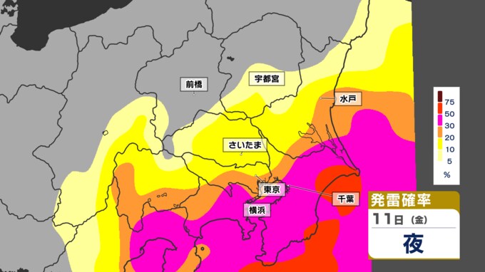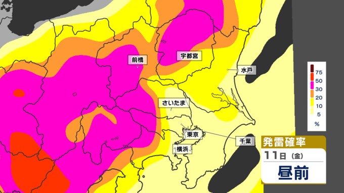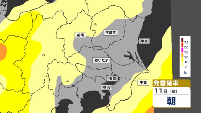 東京首都圏【激しい雨 落雷 突風 ひょう に注意】落雷と突風に関する気象情報 気象庁発表を詳しく【発雷確率、雨、上空の寒気のシミュレーション10日(木)~11日(金)】大気の状態が非常に不安定