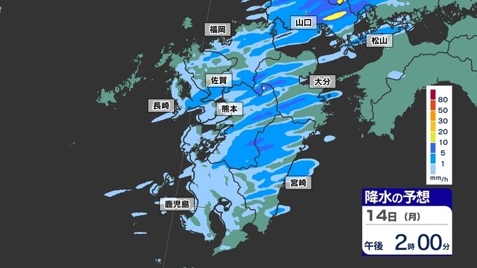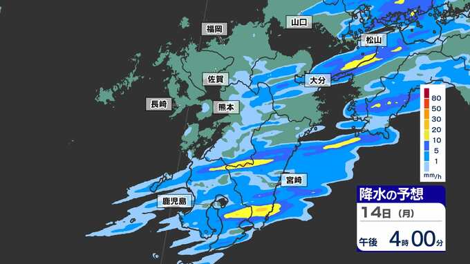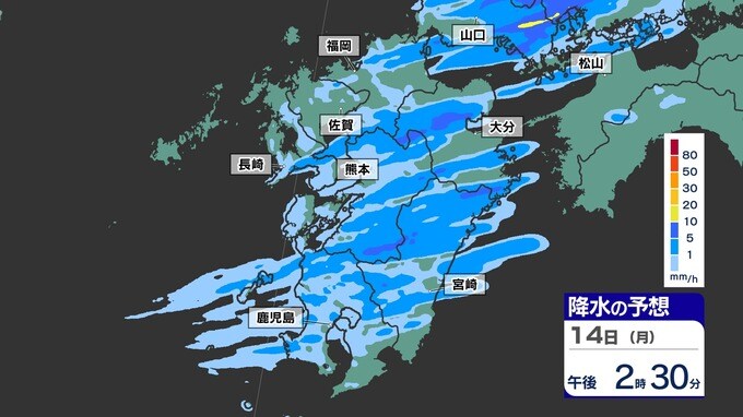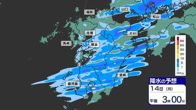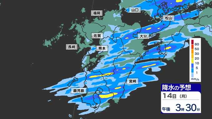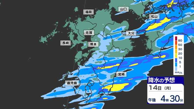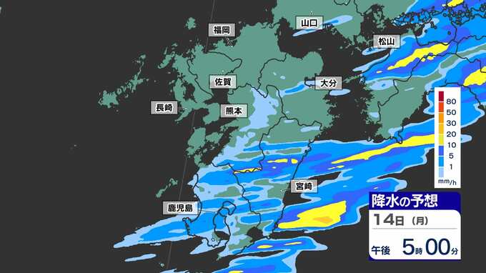 【落雷 突風 竜巻 ひょう 注意】九州の発雷確率75%以上 大気の状態非常に不安定【30分ごとの雨、発雷確率、上空の寒気のシミュレーション14日(月)~15日(火)】福岡・佐賀・長崎・大分・熊本・宮崎・鹿児島 2025年4月14日(月) 17:00 国内 天気 【雨】のシミュレーション(30分ごと) 局地的に、予想以上に雨雲が発達する可能性が高く、また強い風を伴う見込みです。画像で確認できます。