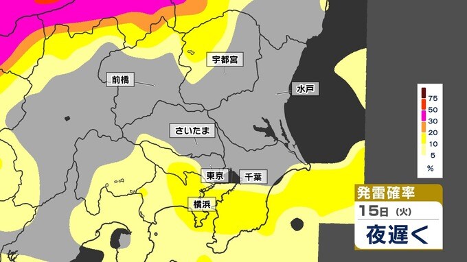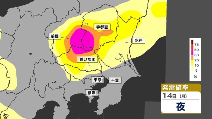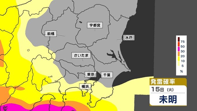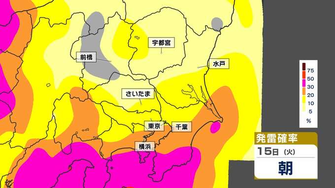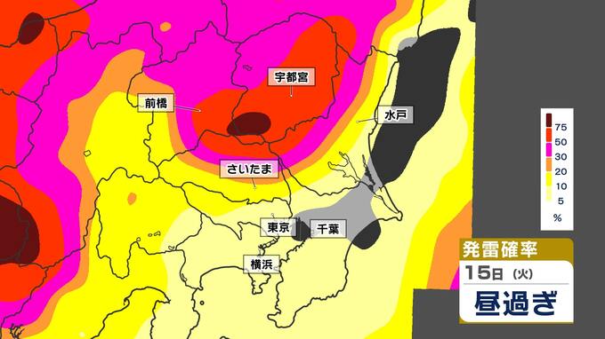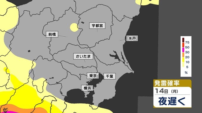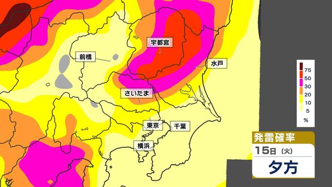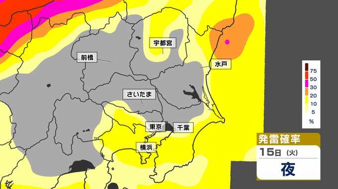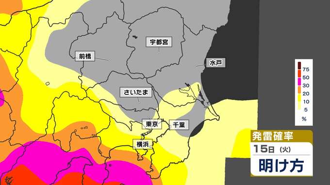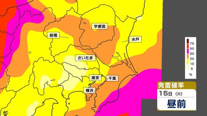 【東京 横浜 さいたま 首都圏】天気の急変 落雷 突風 ひょう 局地的な激しい雨 に注意【発雷確率、雨、上空の寒気のシミュレーション14日(月)~15日(火)】きょう 九州で「ひょう」を降らせた寒気がやってくる 2025年4月14日(月) 19:30 国内 天気 【発雷確率】のシミュレーション 《発雷確率》つまり雷の発生確率は、大気の状態の目安になります。確率が高ければ〈大気の状態が不安定〉で、それだけ〈急な強い雨〉や〈雷〉〈ひょう〉が発生する可能性が高くなります。画像で確認できます。