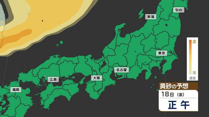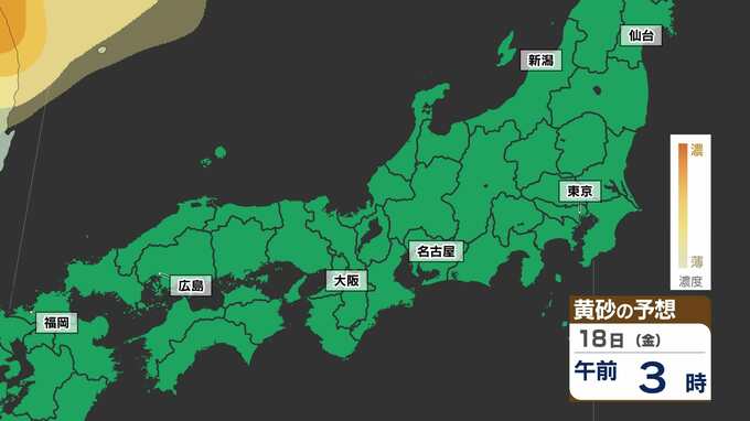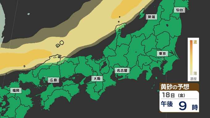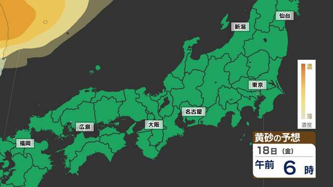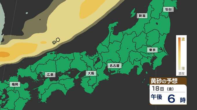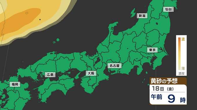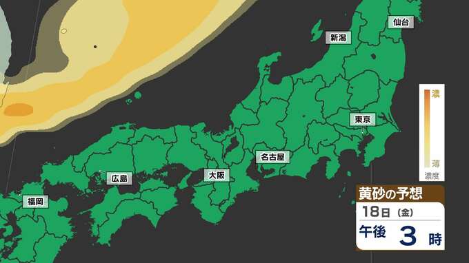【東京に黄砂の予想】広島・大阪・名古屋・東京注意 洗たくもの外干し 洗車は待って【黄砂シミュレーション18日(金)~20日(日)】黄砂いつどこで・濃さは 2025年4月17日(木) 18:00 国内 天気 黄砂のシミュレーション18日(金)~20日(日) 18日(金)夜には、山陰地方に黄砂が飛来し、19日(土)は中国地方から関東地方の広い範囲に黄砂が予想されています。20日(日)は、はじめ関東地方に予想されていますが、だんだんと弱まる見込みです。画像でご確認ください。