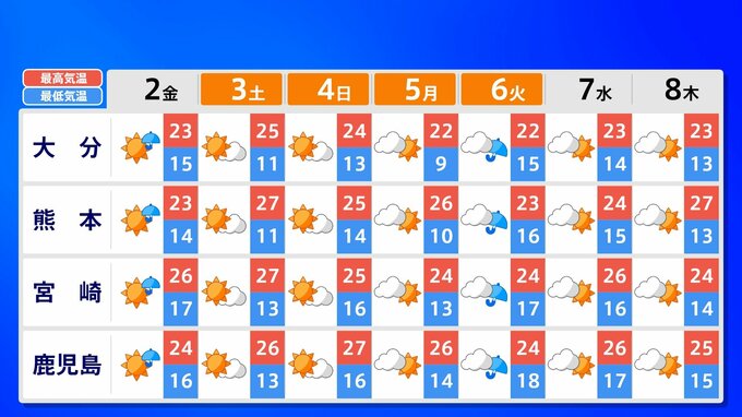 【落雷と突風に関する気象情報】九州・奄美 大気の状態が非常に不安定【雨・雷シミュレーション5月1日~2日 / 連休後半の天気】福岡・佐賀・長崎・大分・熊本・宮崎・鹿児島「きょうは〈本降りの前〉に帰宅しよう」気象庁の予想詳しく 2025年5月1日(木) 13:00 国内 天気 ゴールデンウィーク後半の天気は? 雨は2日(金)の明け方までに止んで、その後回復に向かいます。乾いた空気を持った高気圧に覆われるため、4日(日)にかけて清々しい陽気になるでしょう。 5日(月)はゆっくり下り坂で、連休最終日6日(火)は前線の影響で、広く雨が降る見込みです。画像で確認できます。