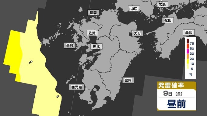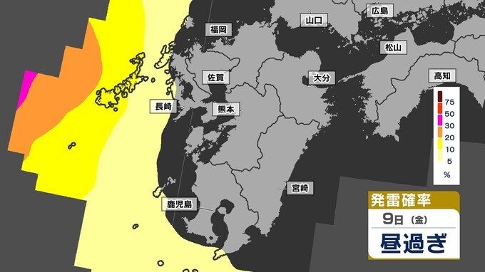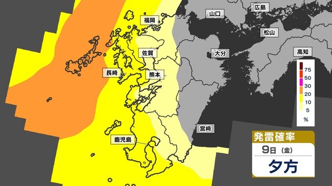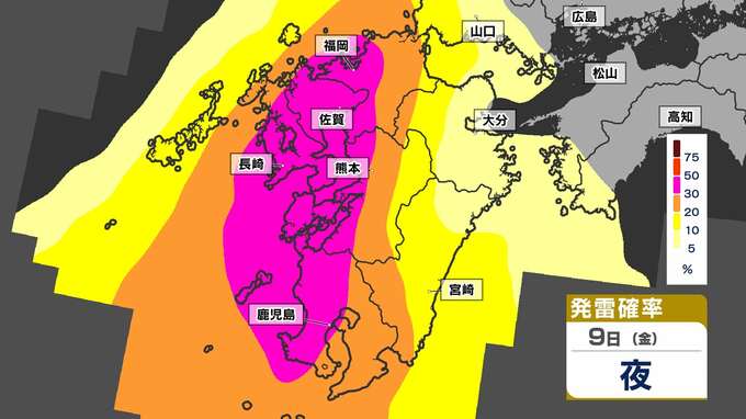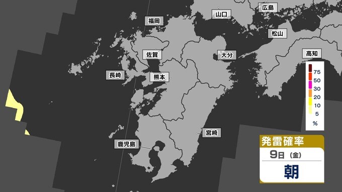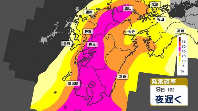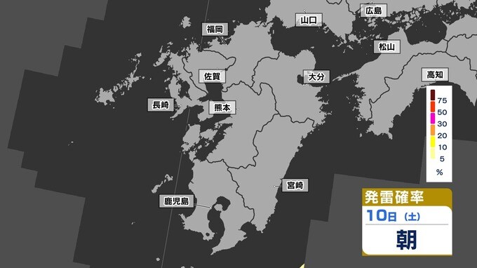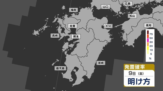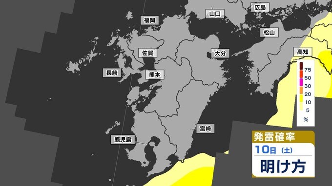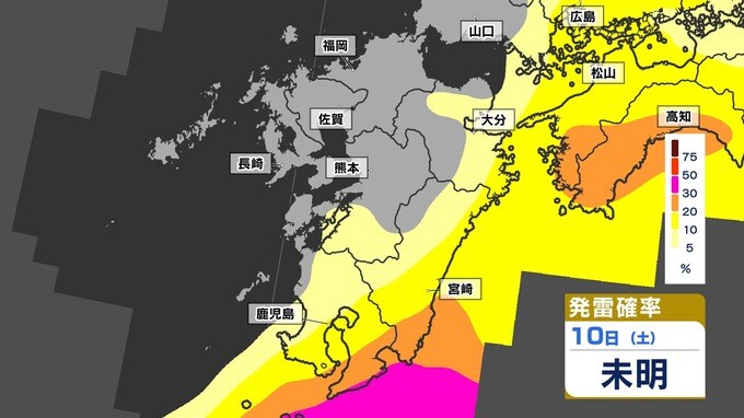 【警報級 暴風 大雨のおそれ】暴風と大雨に関する気象情報 発表【雨・風・発雷確率のシミュレーション9日(金)~10日(土)】福岡・佐賀・長崎・大分・熊本・宮崎・鹿児島 気象台発表詳しく 2025年5月8日(木) 19:00 国内 天気 【発雷確率】のシミュレーション9日(金)~10日(土) 〈発雷確率〉つまり雷の発生確率は、大気の状態の目安になります。確率が高ければ〈大気の状態が不安定〉で、それだけ〈急な強い雨〉や〈雷〉〈ひょう〉が発生する可能性が高くなります。画像で確認できます。