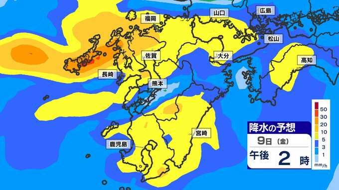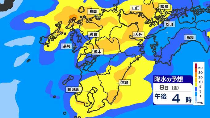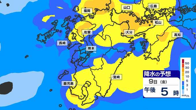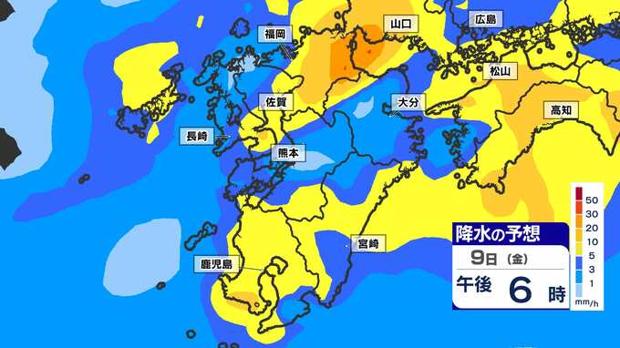 【暴風と大雨に関する気象情報】福岡100ミリ 熊本120ミリ 鹿児島150ミリ 暴風警報発表 大雨警報の可能性もあり【雨・発雷確率のシミュレーション9日(金)~10日(土)/ 土日の天気】福岡・佐賀・長崎・大分・熊本・宮崎・鹿児島 気象台発表詳しく 2025年5月9日(金) 13:00 国内 天気 雨のシミュレーション9日(金)~10日(土) 9日(金)朝から雨が降り出し、夜は活発な雨雲が予想されています。10日(土)朝までに雨は止む見込みです。1時間ごとの雨のシミュレーションは、画像で確認できます。