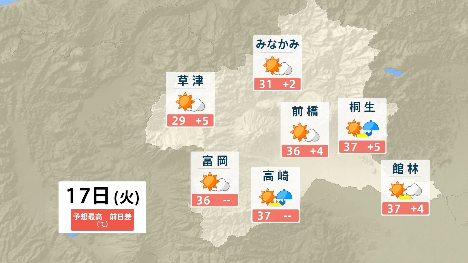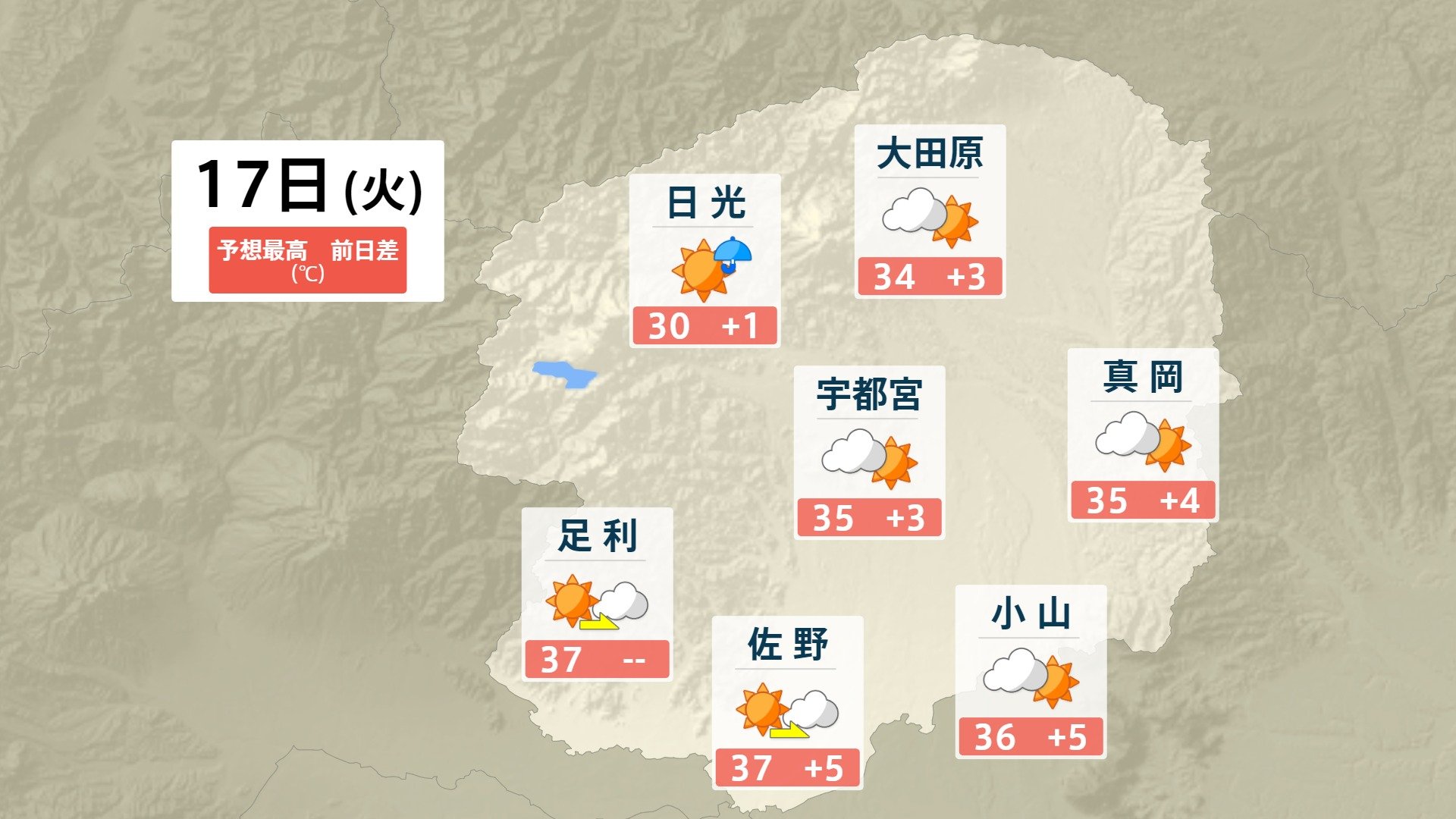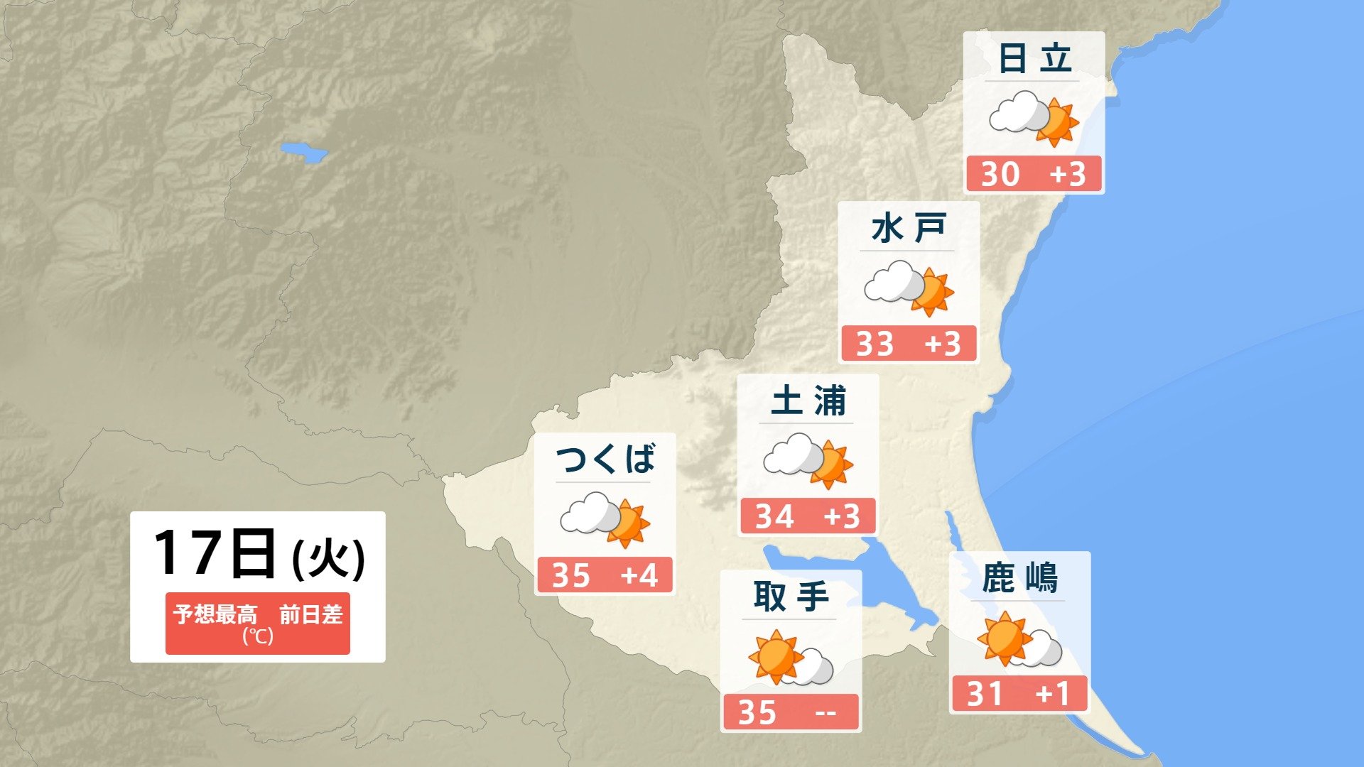 17日(火)予想最高気温〈多くの地点で35℃以上〉