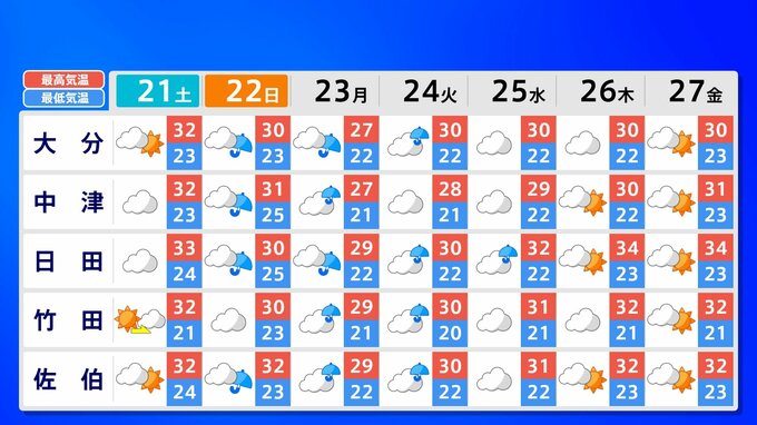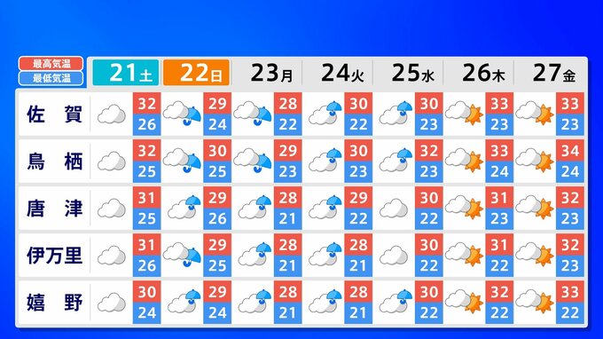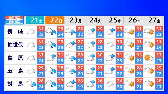 【梅雨前線 九州北部付近で停滞へ】梅雨空戻る 雨はいつから?【雨のシミュレーション22日(日)~25日(水)・週間予報】福岡・佐賀・長崎・大分・熊本・宮崎・鹿児島 2025年6月20日(金) 13:00 国内 天気 週間予報(福岡・佐賀・長崎・大分・熊本・宮崎・鹿児島) 21日(土)下り坂、22日(日)から25日(水)まで雨の予報が続きます。ただ暑さは一段落、最高気温が30℃を下回るところも出てくるでしょう。九州各地の週間予報と予想気温は、画像で確認できます。