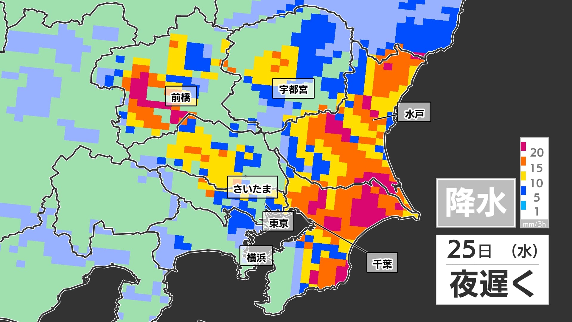 【東京首都圏 ゲリラ豪雨に注意】台風2号から変わる熱帯低気圧接近で大雨のおそれ【きょうあす雨・台風の雨風シミュレーション・警報発表の可能性は?】東京・神奈川・埼玉・千葉・群馬・栃木・茨城 2025年6月24日(火) 12:25 国内 天気 雨のシミュレーション24日(火)~25日(水) ゲリラ豪雨、突然の雷雨に気を付けてください。局地的に短い時間で非常に激しく降るおそれがあります。雨のシミュレーションは3時間の降水量を予想したもので、関東地方の広い範囲に雨が予想されています。