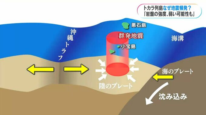 八木原准教授によりますと、今、地震が相次いでいる陸側のプレートは、西側の沖縄トラフと東側の海洋プレートに挟まれています。双方の力でひずみがたまってプレートの弱い部分が繰り返し崩れ、それが地震になっているといいます。