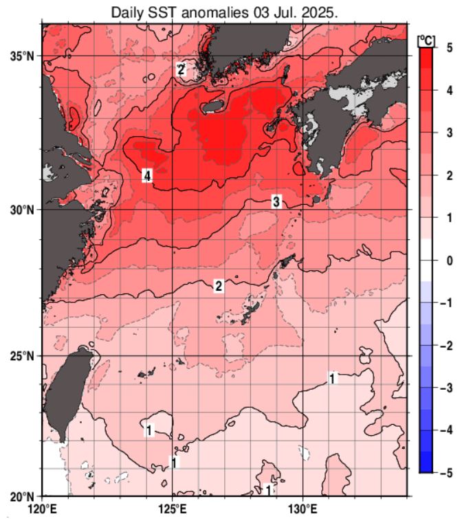 【24時間以内に台風発生へ】 台風のたまご=熱帯低気圧が発達 東シナ海で停滞 今後の動向注意【雨・風シミュレーション7月4日(金)~9日(水)】気象庁発表詳しく 2025年7月4日(金) 12:00 国内 天気 【次の台風】停滞し進路がはっきりしない 次の台風は、台湾の高い山で勢力を落とすため、あまり発達しない予想です。しかし、台湾近海や東シナ海は海水温が高く、しかも平年より30℃以上と高いため、 台湾を抜けたあと、東シナ海を進むと勢力が増す可能性があります。 【海面水温】7月3日時点で30℃以上とかなり高い(気象庁HP より) 【海面水温平年との比較】東シナ海の海面水温は平年よりかなり高い(気象庁HP より)
