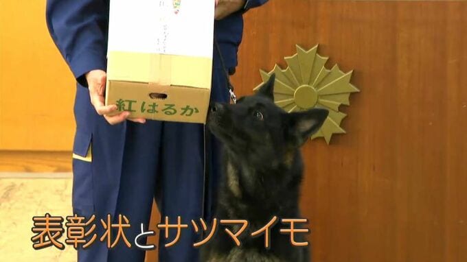 (刑事部鑑識課警察犬係 福留明光さん)「あっ好物のお芋だ、うれしいなと思っている。県民の期待に応えられる犬になるよう訓練に励みたい」