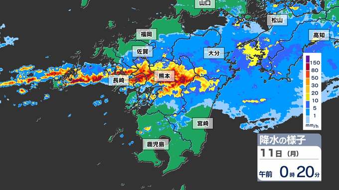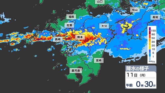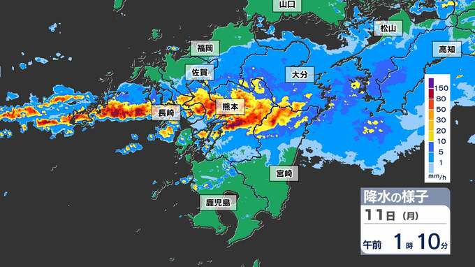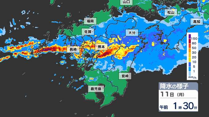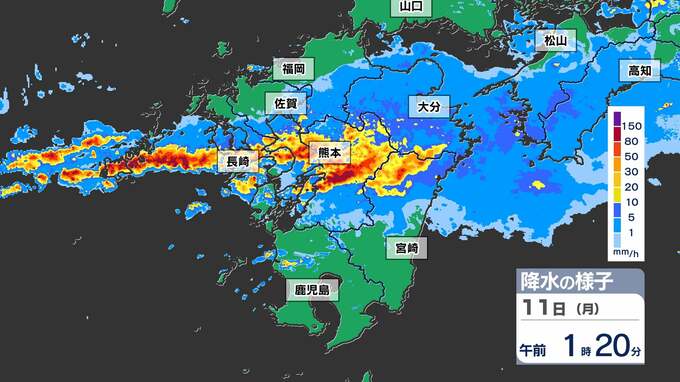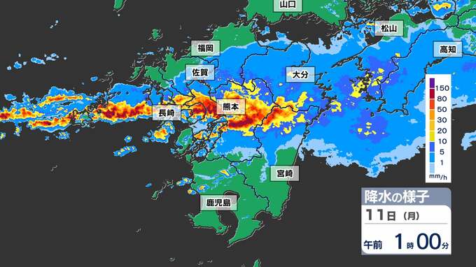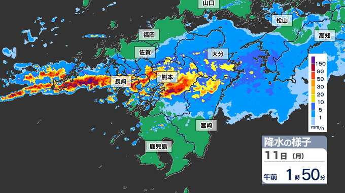 【九州 大雨情報】線状降水帯はゆっくり南下「大雨と突風に関する情報」気象台発表詳しく 熊本県に大雨特別警報【雨のシミュレーション11日(月祝)】福岡・佐賀・長崎・大分・熊本・宮崎・鹿児島 2025年8月11日(月) 04:57 国内 天気 【雨雲の様子】午前0時以降 線状降水帯は、福岡県・大分県・熊本県と南下していますが、南下するスピードが遅くなり、長崎県・熊本県でやや停滞気味となっています。