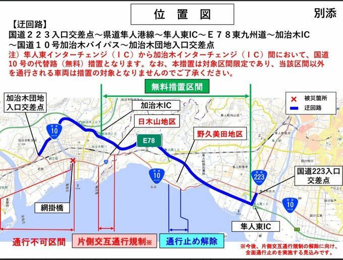 応急工事が終わって、通行止めが解除されたのは、国道10号の霧島市隼人町・野久美田地区と、姶良市の日木山地区です。日木山地区は片側交互通行です。