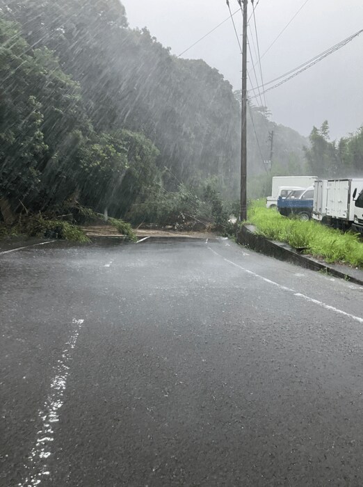 鹿児島市春山町の県道35号永吉入佐鹿児島線では、21日午後5時30分ごろ、道路に木が倒れ、通れなくなっています。現場はお茶の里近くです。