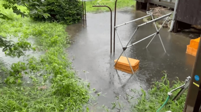 南さつま市加世田津貫では、民家の庭先まで水が上がっています。物干し竿の土台が完全に見えなくなり、プラスチックのケースが浮いています。