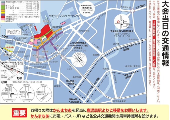 実行委員会事務局は、「帰りは混雑が予想されますが、各公共交通機関をご利用ください。特にJRを増便していますので、ぜひ鹿児島駅を起点にご移動ください。」と呼びかけています。