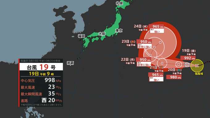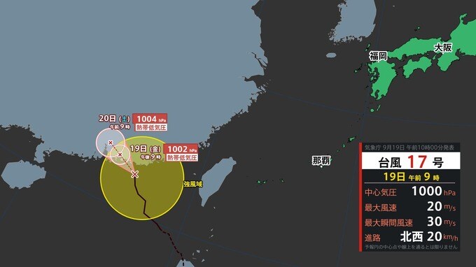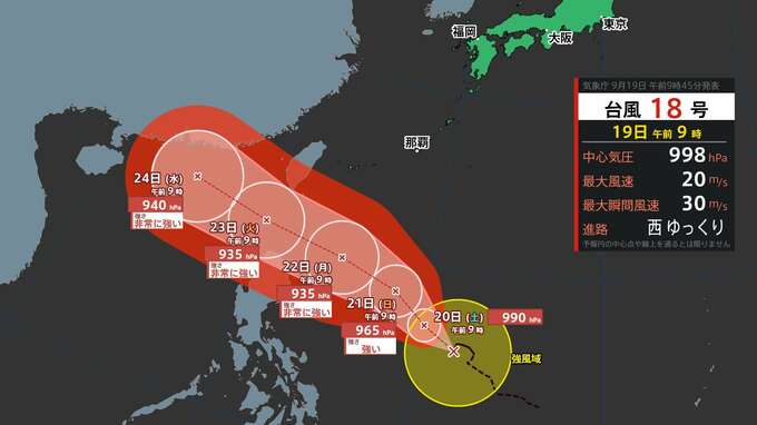 台風が3つ相次いで発生しました。フィリピン付近で発生した「台風17号」は、南シナ海を通り中国南部に向かい、20日(土)には熱帯低気圧に変わる見込みです。「台風18号」は、台湾とフィリピンの間(バシー海峡)方向に向かうため、沖縄県先島諸島では22日(月)から23日(火祝)はうねりを伴った大しけとなるおそれがあります。「台風19号」は、日本の東のウェーク島近海にあって、日本に向かって西寄りに進んでいますが、日本に近づく前にUターンして日本から遠ざかってくれそうです。
