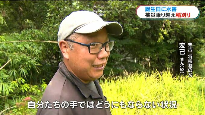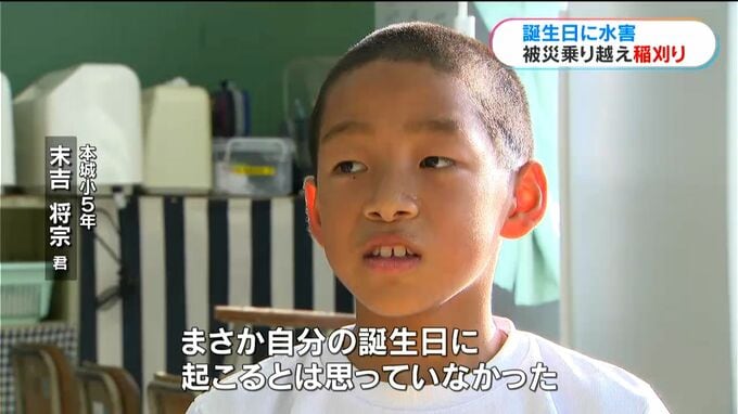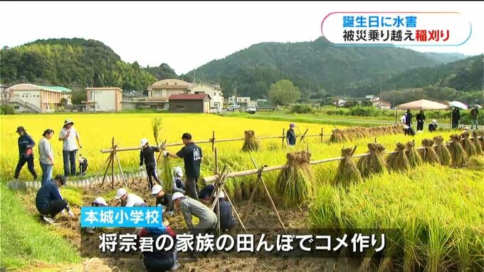 本城小学校では毎年、将宗君の家族の田んぼを借りて、コメ作りを体験しています。今年、子どもたちが稲を植えた田んぼは被害を免れ、きょう3日、無事に収穫できました。