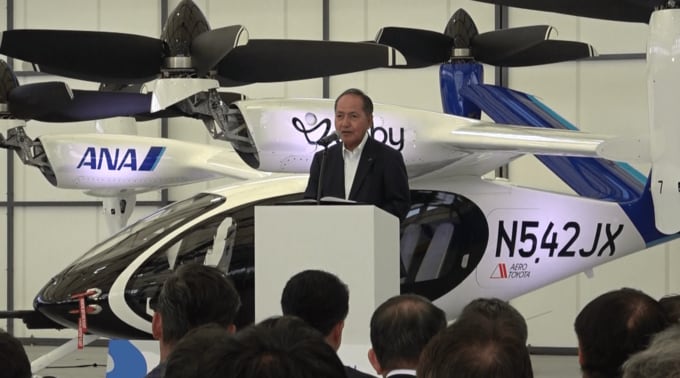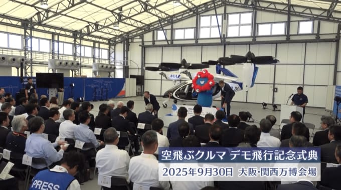 この日披露されたのは、アメリカのジョビー社が開発した最新の電動垂直離着陸機です。パイロットを含む5人が搭乗でき、最高速度は時速320キロ、航続距離160キロです。