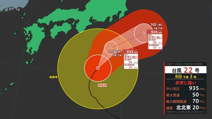 非常に強い台風22号は、「非常に強い」勢力を維持したまま、9日(木)明け方から朝に伊豆諸島に最も接近する予想です。これまでに経験したことのないような暴風や高波になるおそれがあり、八丈島に暴風と波浪の『特別警報』が発表されました。また、伊豆諸島では9日未明から昼前にかけて、線状降水帯が発生して大雨災害発生の危険度が急激に高まる可能性があります。