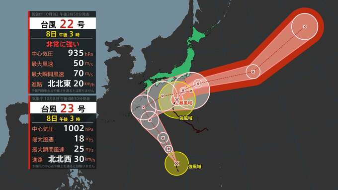非常に強い台風22号は、「非常に強い」勢力を保ったまま、9日(木)明け方から朝にかけて、伊豆諸島付近に近づく見込みです。またフィリピンの東の「熱帯低気圧」が発達し『台風23号』が発生しました。