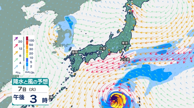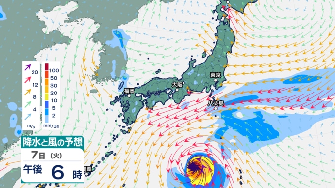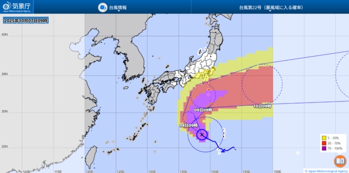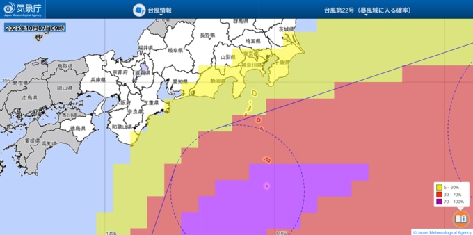 気象庁HPによると、暴風域に入る確率は、伊豆諸島の一部が70%から100%、伊豆諸島南部が30%~70%、伊豆諸島北部や静岡、神奈川、東京、千葉、茨城などが5%~30%となっています。