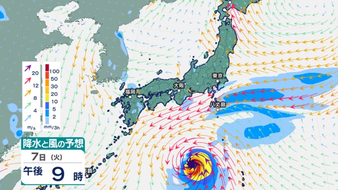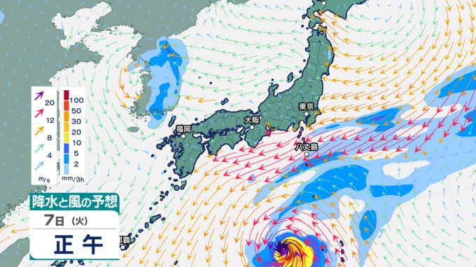 雨・風シミュレーション(GSM5日間モデル)では、台風22号が関東地方に近づき、中心付近が伊豆諸島を通過するような進路となっています。また、11日(土)ごろから新たな「渦」が、南西諸島付近に見える予想です。シミュレーションは予想のひとつで、大きく変わる可能性があります。気象庁から発表される最新の台風情報に注意してください。