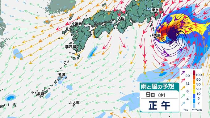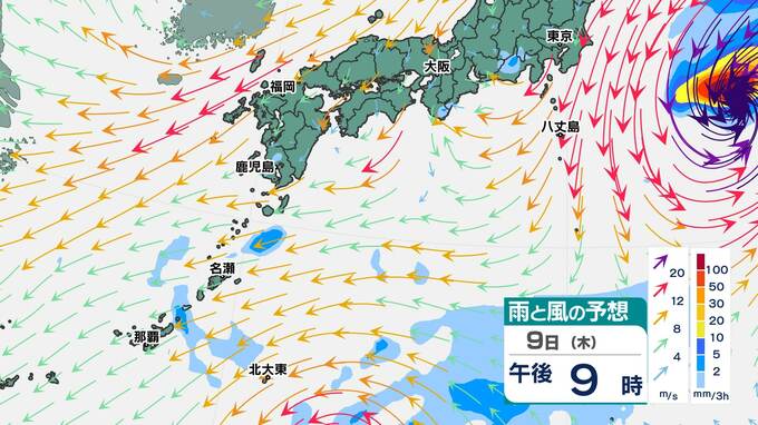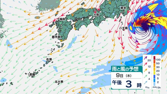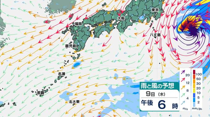 台風23号の雨雲は、10日(金)ごろから沖縄・奄美地方にかかり始めます。このシミュレーションでは、台風23号は東シナ海を進んで、九州南部付近を通り、列島の太平洋側を東に進む予想です。