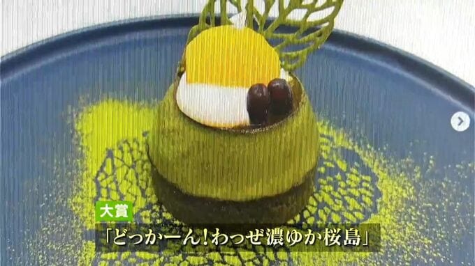 コンテストではお茶の使い方や見映えなどを審査。その結果、桜島をイメージした抹茶プリンタルト、「どっかーん!わっぜ濃ゆか桜島」が大賞を受賞しました。