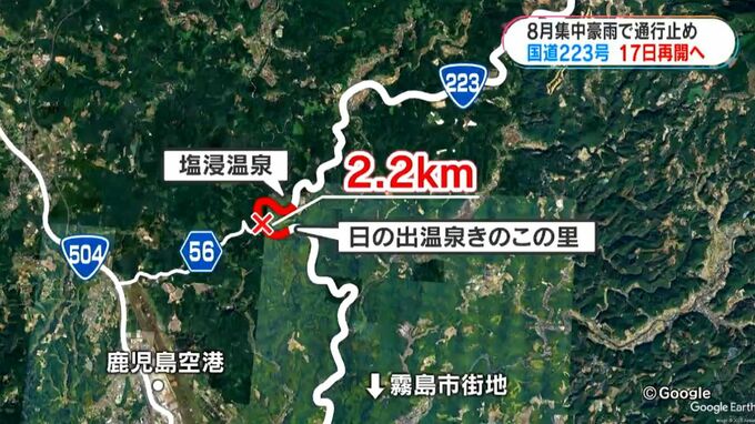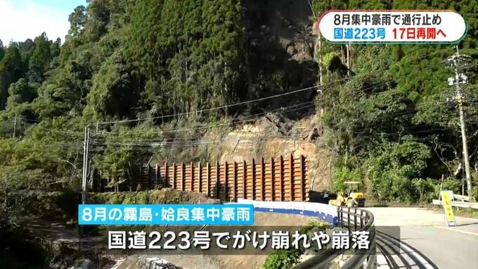 今年8月の集中豪雨から2か月。土砂崩れで通行止めとなっている霧島市街地と霧島温泉郷を結ぶ国道223号が、今月17日に通行が再開されることになりました。