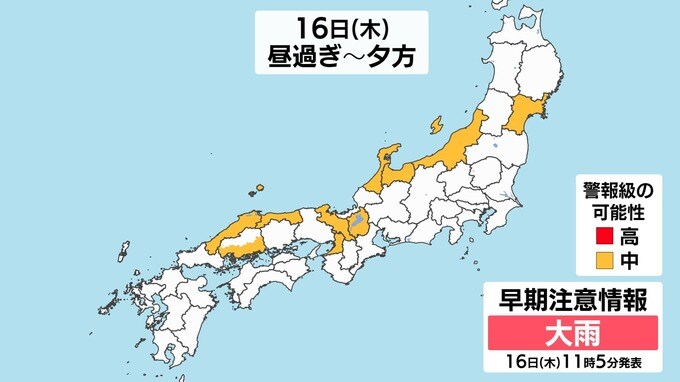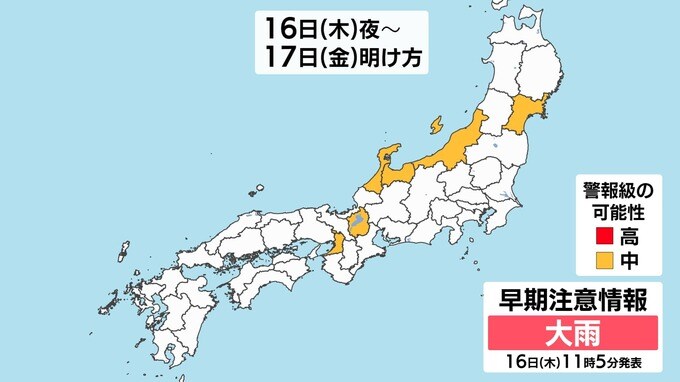 【警報級大雨のおそれ】秋雨前線南下中「雨いつから どこで?」【雨と発雷確率のシミュレーション】警報の可能性がある地域は「気象庁大雨情報」 2025年10月16日(木) 12:00 国内 天気 【地図で確認】大雨警報・洪水警報の可能性がある地域は? 雨雲が予想以上に発達した場合や、発達した雨雲がかかり続けた場合には、警報級の大雨となる可能性があります。日本海側では警報級の可能性【中】となっています。画像で確認できます。