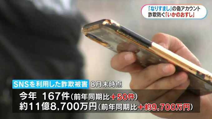 県警によりますと、県内ではこうしたSNSを利用した詐欺被害が今年8月末時点で167件と、去年を上回るペースです。被害額もおよそ11億8700万円で、およそ9700万円増えています。