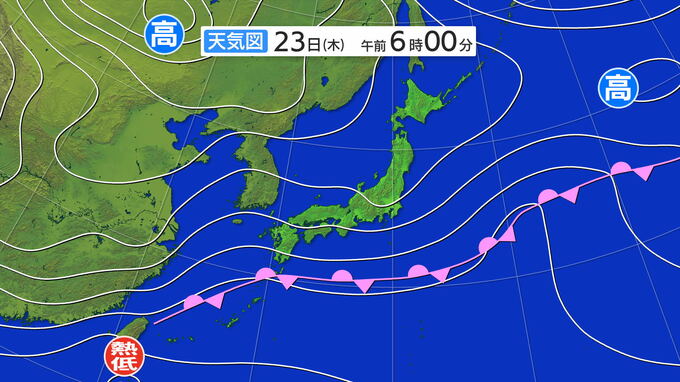 台湾付近の「台風のたまご=熱帯低気圧」の北には、秋雨前線が停滞しています。熱帯低気圧の湿った空気も加わって、秋雨前線の活動が活発化しており『沖縄・奄美・種子島屋久島』ではすでに大雨となっています。今後も雨が続くため土砂災害などに厳重に警戒してください。なお秋雨前線は、本州の南側の部分でやや南下し陸地から離れるため、太平洋側の地域では23日(木)は陽射しが戻るところが多いですが、25日(土)には新たな秋雨前線が発生し、再び下り坂に向かうでしょう。