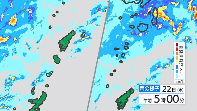 22日に予想される1時間雨量は多い所で、種子島・屋久島地方、十島村で50ミリ、23日午前6時までに予想される24時間雨量は多い所で、種子島・屋久島地方で180ミリ、十島村で150ミリです。