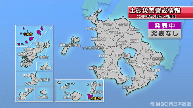 現在、土砂災害警戒情報が、十島村、南種子町に発表されています。