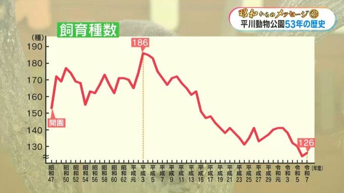 動物園の飼育種類の推移を示したグラフです。開園以降増え続けピークだった平成3年は186種。しかし、その後減少傾向にあり現在はピーク時から3割減り126種です。