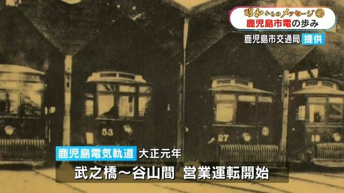 当時の運営会社「鹿児島電気軌道」が、武之橋と谷山の間で営業運転を開始。昭和3年に鹿児島市が路線を買収し、「鹿児島市電気局」を設置したことで、現在の鹿児島市電が本格的にスタートしました。
