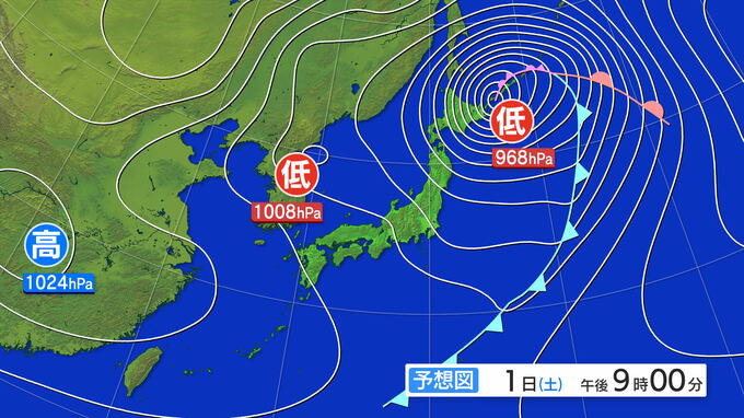 予想される中心気圧は、31日(金)午後9時に潮岬付近で〈1000hpa〉、11月1日(土)午前9時に三陸沖で〈984hpa〉と予想され、12時間で16hpaも下がる【爆弾低気圧】の基準を超える発達となりそうで、「危険な低気圧」です。