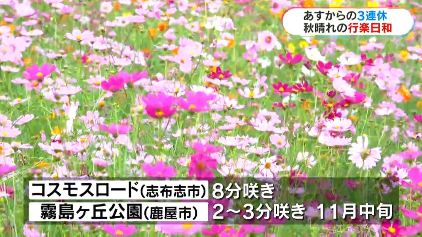 志布志市のコスモスロードはいま8分咲き、鹿屋市の霧島ヶ丘公園は2~3分咲きで、見頃は11月中旬の見込みです。