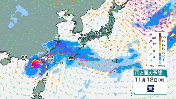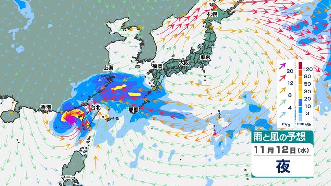 大型で強い台風26号の「反時計回りの渦」は、ハッキリしていますが、台湾に近づく13日(木)になると、「反時計回りの渦」は崩れ、だんだんと不明瞭になってきます。