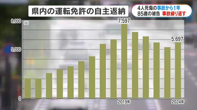 県内の運転免許の自主返納は、池袋での暴走事故で母親と3歳の娘が亡くなった2019年の7597人以降、減少傾向が続いたものの、去年は5697人で増加に転じました。