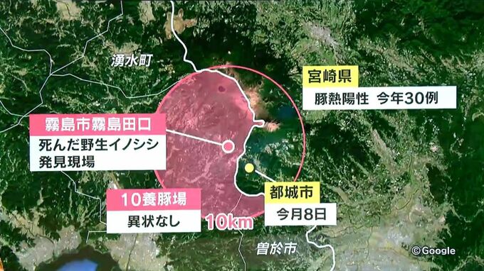 今回、死んだ野生イノシシが見つかったのは、宮崎県都城市との県境から2キロの場所です。ここから半径10キロ圏内にある10の養豚場では、異常がないことが確認されています。