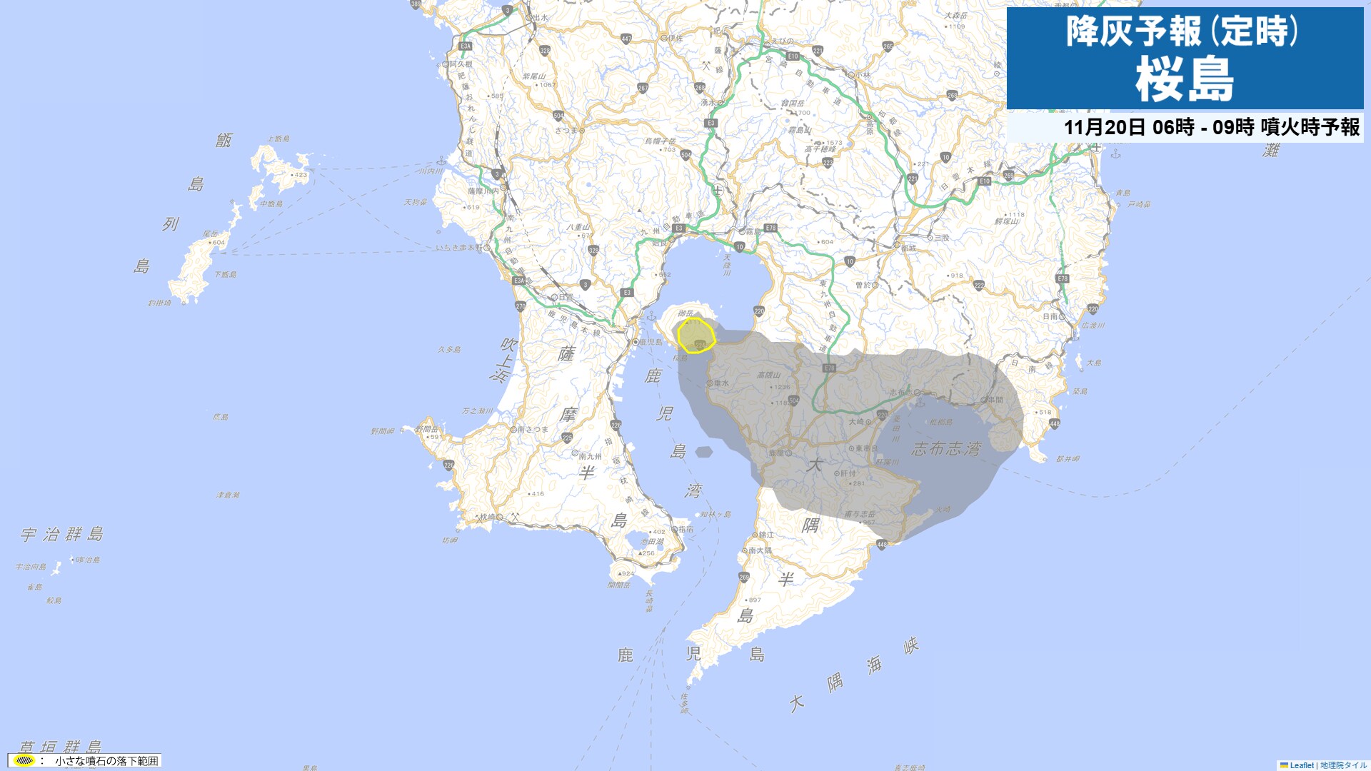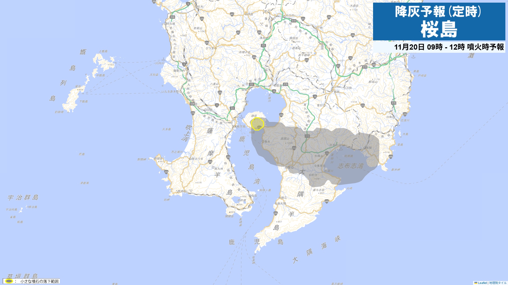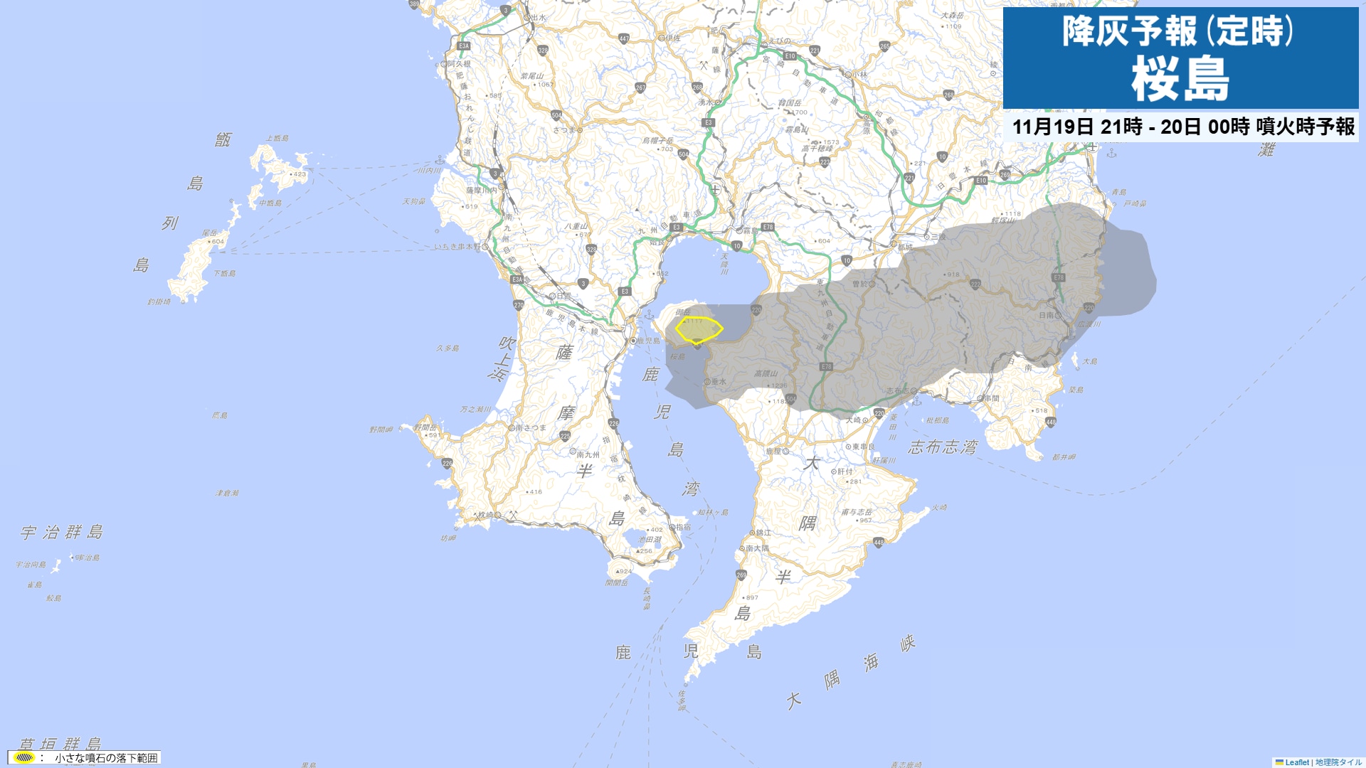 19日18時から20日12時までに噴火が発生した場合には、以下の方向・距離に降灰及び小さな噴石の落下が予想されます。