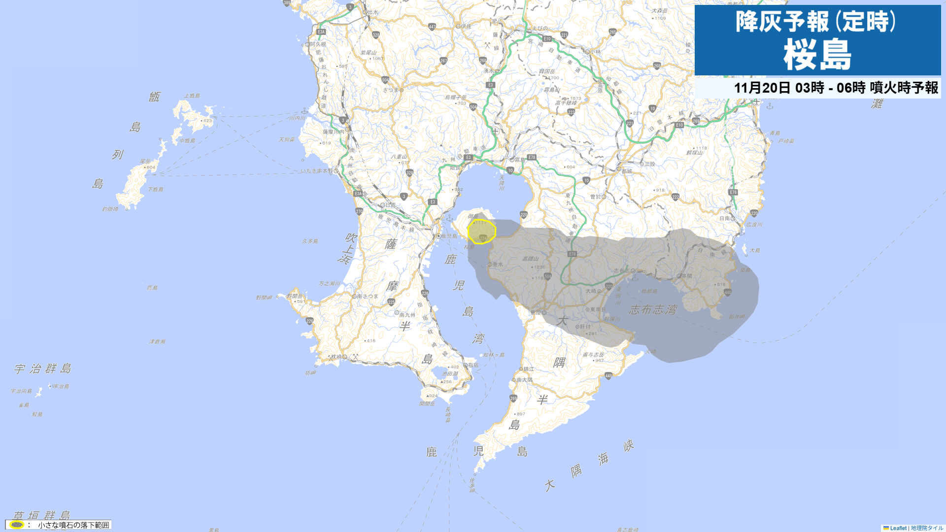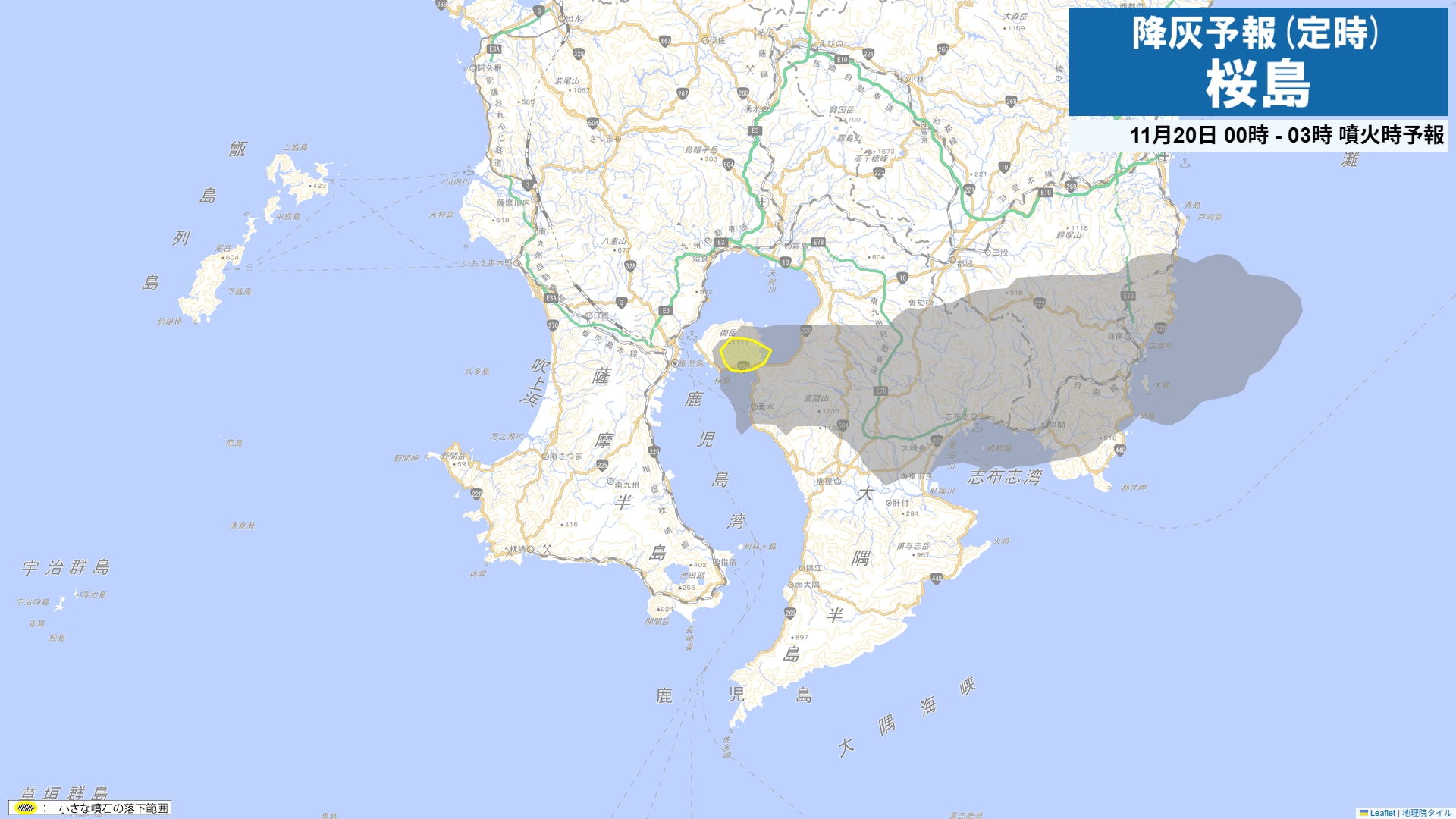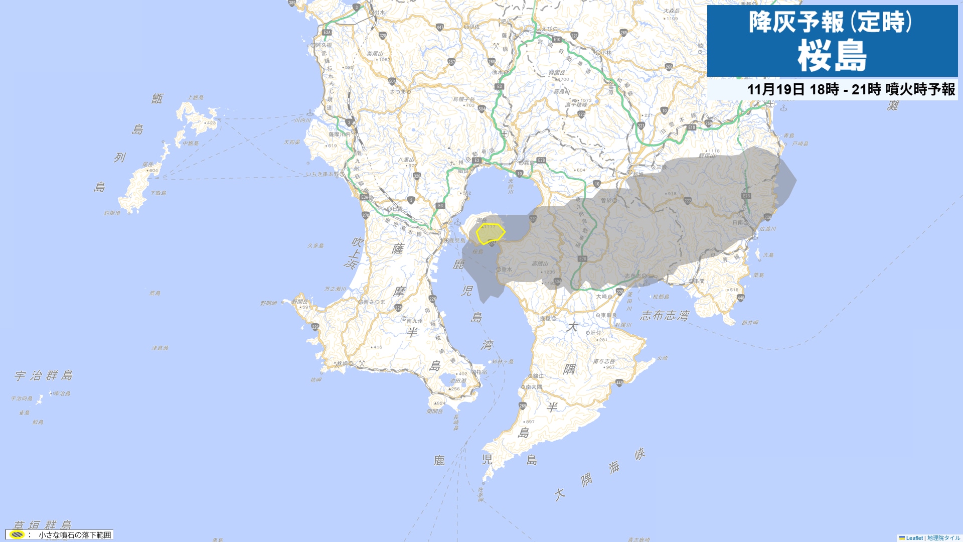 19日18時から20日12時までに噴火が発生した場合には、以下の方向・距離に降灰及び小さな噴石の落下が予想されます。